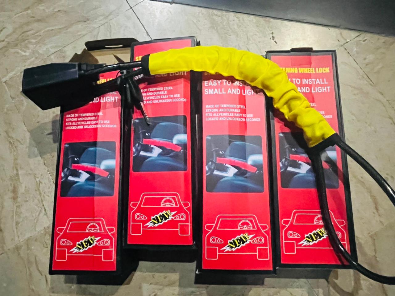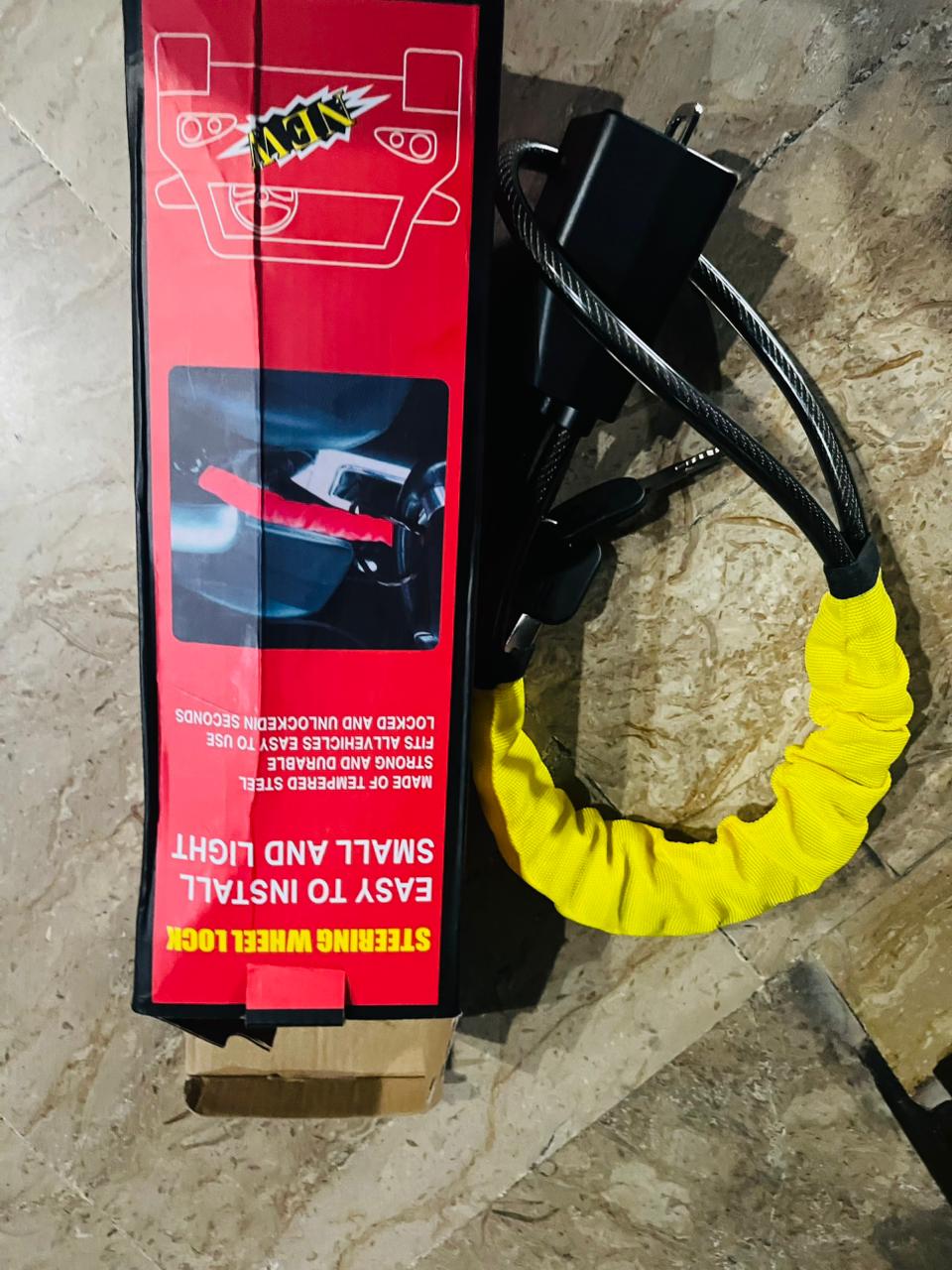 A steering wheel lock is a vehicle anti-theft device that attaches to the steering wheel to prevent it from turning. It is usually made of strong metal and locks in place with a key or combination mechanism. When installed, it blocks the wheel from rotating, making it difficult for someone to steal the vehicle. It is commonly used as a visible deterrent against theft.